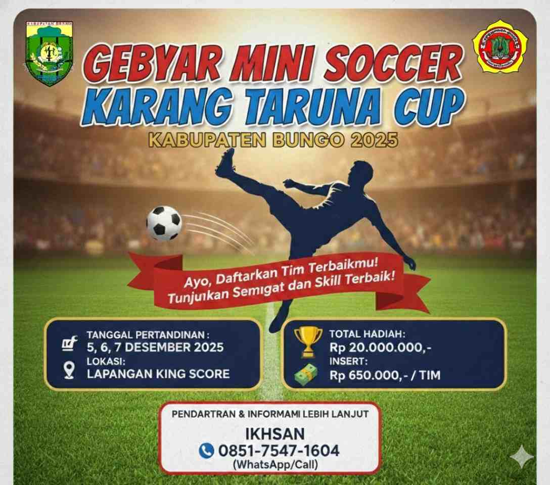 dutapers.com, BUNGO – Gelaran Gebyar Mini Soccer Karang Taruna Cup Kabupaten Bungo 2025 segera di mulai dan mendapat sambutan positif dari berbagai kalangan pemuda di daerah.